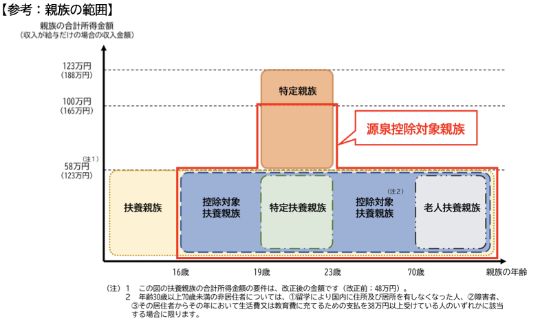 なお、令和8年1月1日以後に支払うべき給与等または公的年金等から、合計所得金額が58万円超100万円以下(公的年金等については85万円以下)の特定親族がいる場合には、源泉徴収において適用となります。(合計所得金額が100万円超(公的年金等については85万円超)の場合は年末調整または確定申告にて適用)