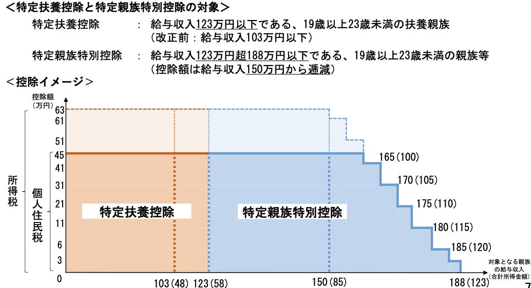 令和7年度以後は、大学生年代の子のバイト代(給与収入)が150万円(住民税は160万円)までであれば、親の所得控除(特定親族特別控除)として63万円(住民税は45万円)控除、バイト代が188万円を超えると控除額は0円となります。