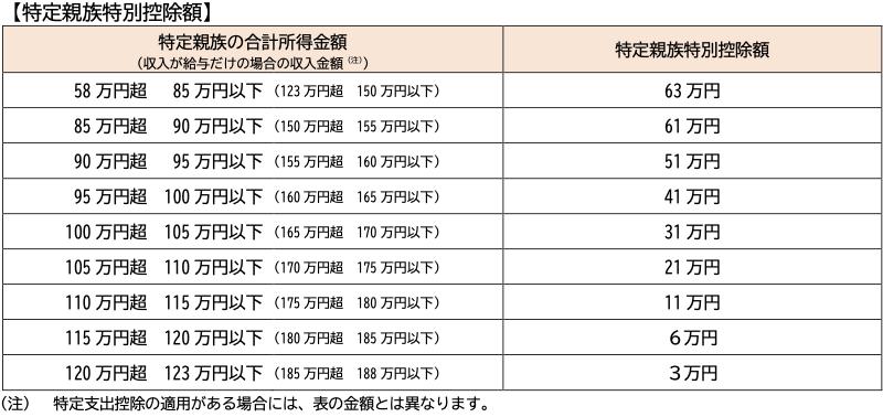 対象となる特定親族とは、居住者と生計を一にする年齢19歳以上23歳未満の親族(配偶者、青色事業専従者として給与の支払を受ける人及び白色事業専従者を除きます。)で合計所得金額が58万円超123万円以下(注)の人をいいます。