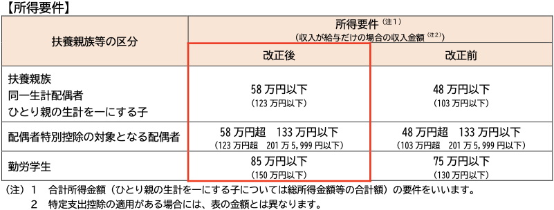 配偶者控除所得要件:合計所得金額48万円以下 ⇒ 58万円以下